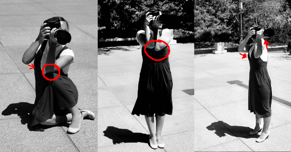 ៣. ជង្គង់ជាជើងទម្រកាមេរ៉ា ជង្គង់អ្នកអាចប្រើប្រាស់ជាជើងទម្រកាមេរ៉ាបាន បន្ទាប់មកដាក់កែងដៃខាងឆ្វេងនៅលើជង្គង់ ចំណែកឯកែងដៃខាងស្ដាំផ្អឹបជាប់នឹងទ្រូង។
