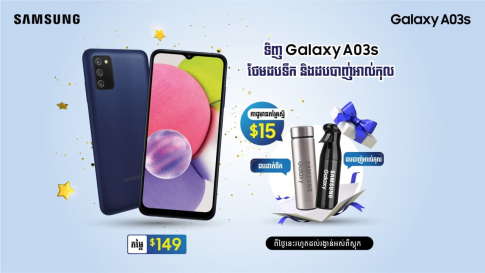 ឱកាសពិសេសនារដូវកាលហូលីដេ និងកម្មវិធីប្រូម៉ូសិនចុងឆ្នាំដ៏អស្ចារ្យពីក្រុមហ៊ុន សាមសុង ជាមួយការថែមជូនកាដូពិសេស រាល់ការទិញទូរស័ព្ទលំដាប់ថវិកា Galaxy A03s ឬ Galaxy ស៊េរី A ២០២១ ម៉ូឌែលណាមួយក៏ដោយនឹងទទួលបាន ដបទឹករក្សាសីតុណ្ហភាព(TUMBLER) និងដបបាញ់ទឹកអាកុល (Spray Bottle) ដ៏ស្រស់ស្អាតពីក្រុមហ៊ុន សាមសុង ភ្លាមៗតែម្តង។