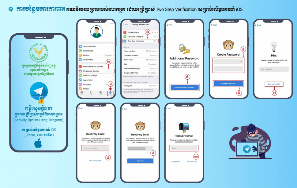 ដើម្បីបង្កើនបន្ថែមនូវសុវត្ថិភាពលើគណនី Telegram របស់អ្នកឱ្យកាន់តែរឹងមាំ មានវិធីច្រើន ប៉ុន្តែអ្នកជំនាញបានណែនាំឲ្យអ្នករើសយកវិធីមួយគឺ កំណត់លក្ខខណ្ឌត្រួតពិនិត្យ ២ ជំហាន ក្នុងការចូលប្រើប្រាស់ Telegram ដែលពាក្យបច្ចេកទេសហៅថា «2 Factors Authentication (អក្សរកាត់ 2FA)»។