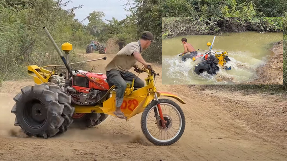 គំនិតច្នៃប្រឌិតម្យ៉ាងដែរ! យុវជនបីនាក់ យកម៉ាស៊ីនគោយន្តកាត់ដាក់ដៃម៉ូតូជិះចូលទឹកដូចទូក