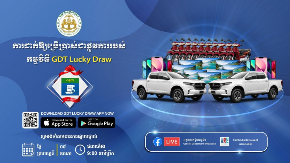 អគ្គនាយកដ្ឋានពន្ធដារ បានបង្កើត App មួយថ្មីទៀតដាក់ឈ្មោះថា GDT lucky Draw ។ កម្មវិធីនេះបង្កើតឡើងសម្រាប់អ្នកប្រើប្រាស់ទូទៅក្នុងការផ្សងសំណាង ដើម្បីមានឱកាសឈ្នះរង្វាន់ជាច្រើនពីអគ្គនាយកដ្ឋានពន្ធដារ ដោយគ្រាន់តែថតរូបវិក្កយបត្រដែលលោកអ្នកបានចំណាយគ្រប់ប្រភេទបញ្ចូលក្នុងកម្មវិធីនោះ។ តាមរយៈកម្មវិធីផ្សងសំណាងនេះរួមមាន៖ រថយន្ត ម៉ូតូ ទូរសព្ទ គ្រឿងអេឡិចត្រូនិច និងរង្វាន់ផ្សេងៗជាច្រើនទៀត។ បញ្ជាក់៖ គ្រប់វិក្កយបត្រដែលអាចចូលរួមផ្សងសំណាងបានលុះត្រាមានលេខ អតប បញ្ជាក់ការចុះបញ្ជីត្រឹមត្រូវ។