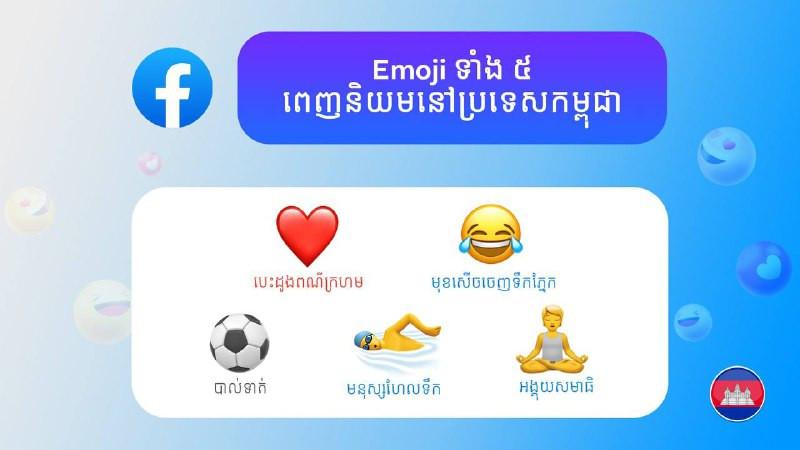 ដើម្បីចូលរួមអបអរទិវា Emoji និង Reaction ពិភពលោកនៅលើ WhatsApp នាថ្ងៃទី ១៧ កក្កដាក្រុមហ៊ុន Meta នឹងមានការចែករំលែកនូវព័ត៌មានកម្សាន្តប្លែកៗជាច្រើនអំពី របៀបដែលប្រជាជនកម្ពុជាប្រើប្រាស់មុខងារ Emoji នៅលើផ្លេតហ្វមទាំងអស់របស់ខ្លួន។ រូប emoji នៅលើបណ្តាញសង្គម Facebook ដែលពេញនិយមបំផុតសម្រាប់ប្រជាជនកម្ពុជាគ្រប់វ័យគឺ រូបបេះដូងពណ៌ក្រហម ចំណែកឯ Emoji ដែលពេញនិយមបន្ទាប់គឺ រូបមុខសើចលាយទឹកភ្នែក។