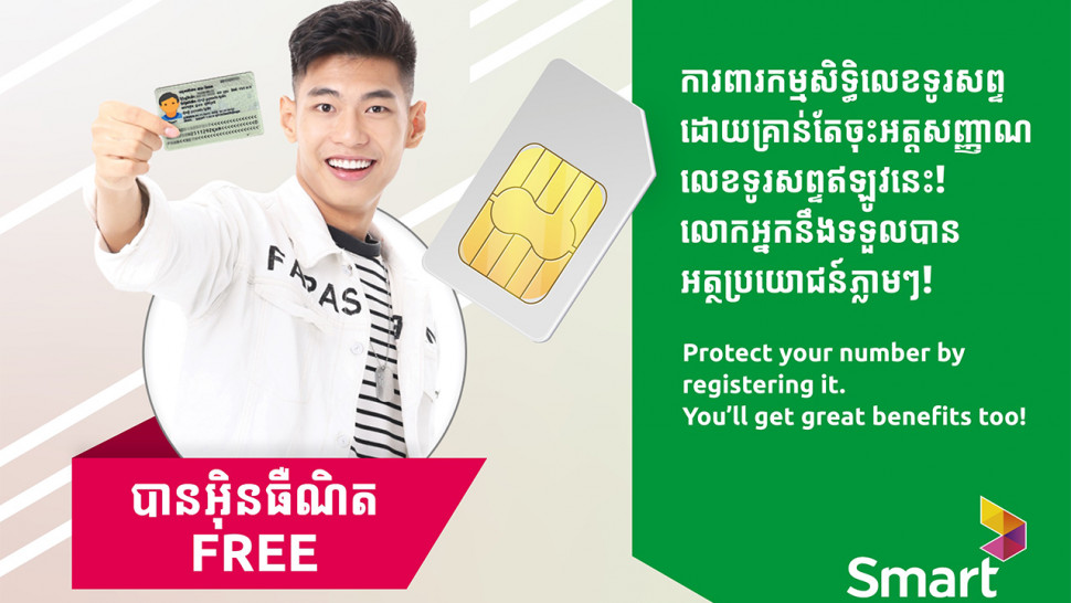 ភ្នំពេញ ថ្ងៃចន្ទ ទី៦ ខែកុម្ភៈ ២០២៣៖ ក្រុមហ៊ុន Smart Axiata ដែលជាក្រុមហ៊ុនទូរគមនាគមន៍ឈានមុខគេនៅកម្ពុជា បានចាប់ផ្តើមនូវយុទ្ធនាការមួយ ដើម្បីលើកទឹកចិត្តអតិថិជនរបស់ខ្លួនឲ្យចុះអត្តសញ្ញាណលេខទូរស័ព្ទ ក៏ដូចជាលើកកម្ពស់ការយល់ដឹងដល់មជ្ឍជនទូទៅផងដែរ។